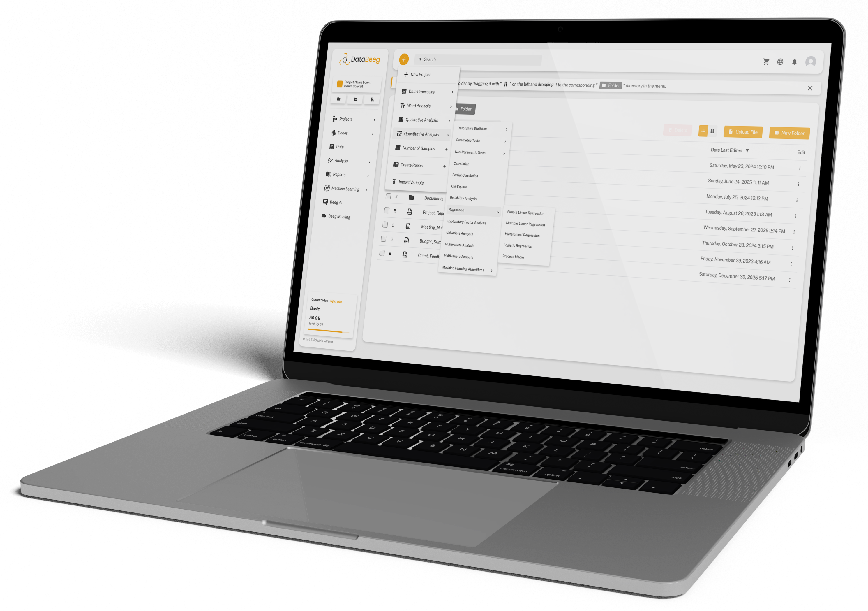 DataBeeg, bilimsel veri analizi için özel olarak tasarlanmış gelişmiş analiz yetenekleriyle donatılmıştır. Karmaşık istatistiksel analizden makine öğrenimi algoritmalarına kadar, programımız araştırmacılara verilerinden anlamlı bilgiler elde etmek için ihtiyaç duydukları araçları sağlar.